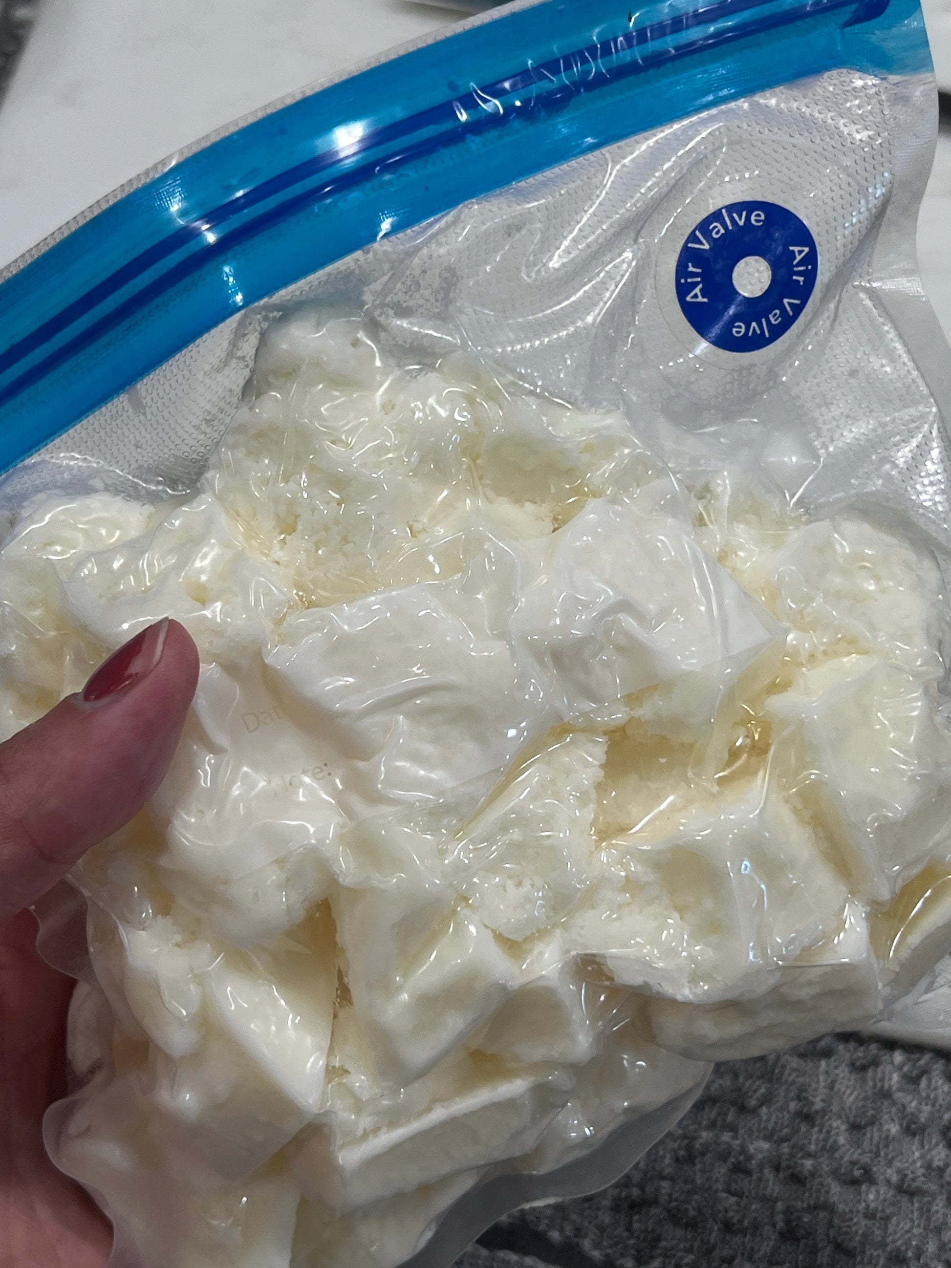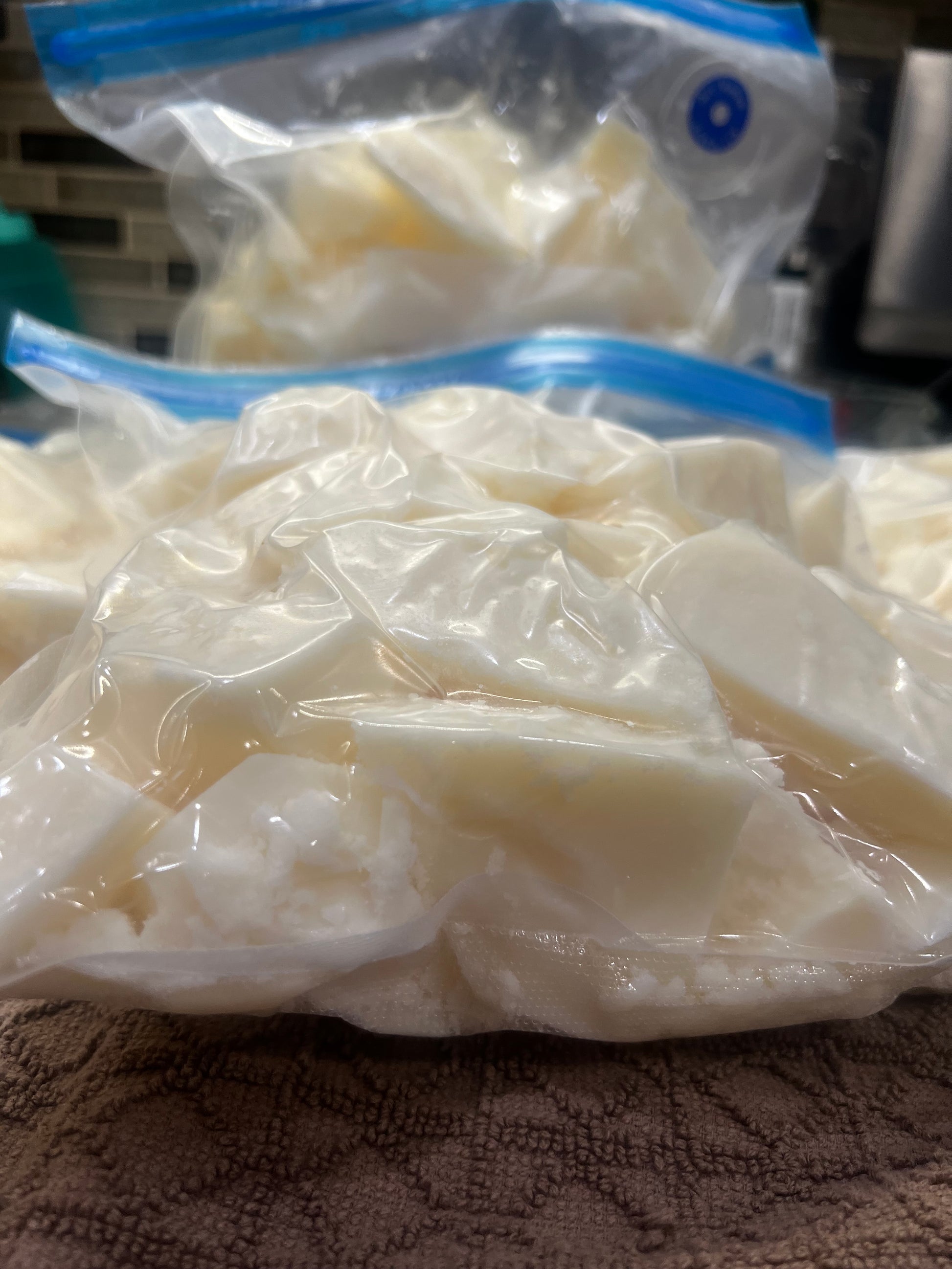 These are in vacuum sealed freezer bags. They are kept frozen until shipped. We recommend keeping them in the freezer until you use them. When you do use them, they need to be placed on medium heat in stainless steel pot for at least 20-30 mins to ensure any moisture from the freezing process is removed. You will hear some popping if there is moisture in there, and you will be able to see beads of water on bottom of pot. Allow this to evaporate off. The boiling/popping will stop when its fully evaporated. This is an important step before you use the tallow for skincare. Moisture naturally collects as we allow our tallow to sit in the freezer not fully sealed for several days after rendering, before we place in vacuum sealed bags. This helps minimize the scent of the tallow, but it will also gather a tiny bit of moisture too.