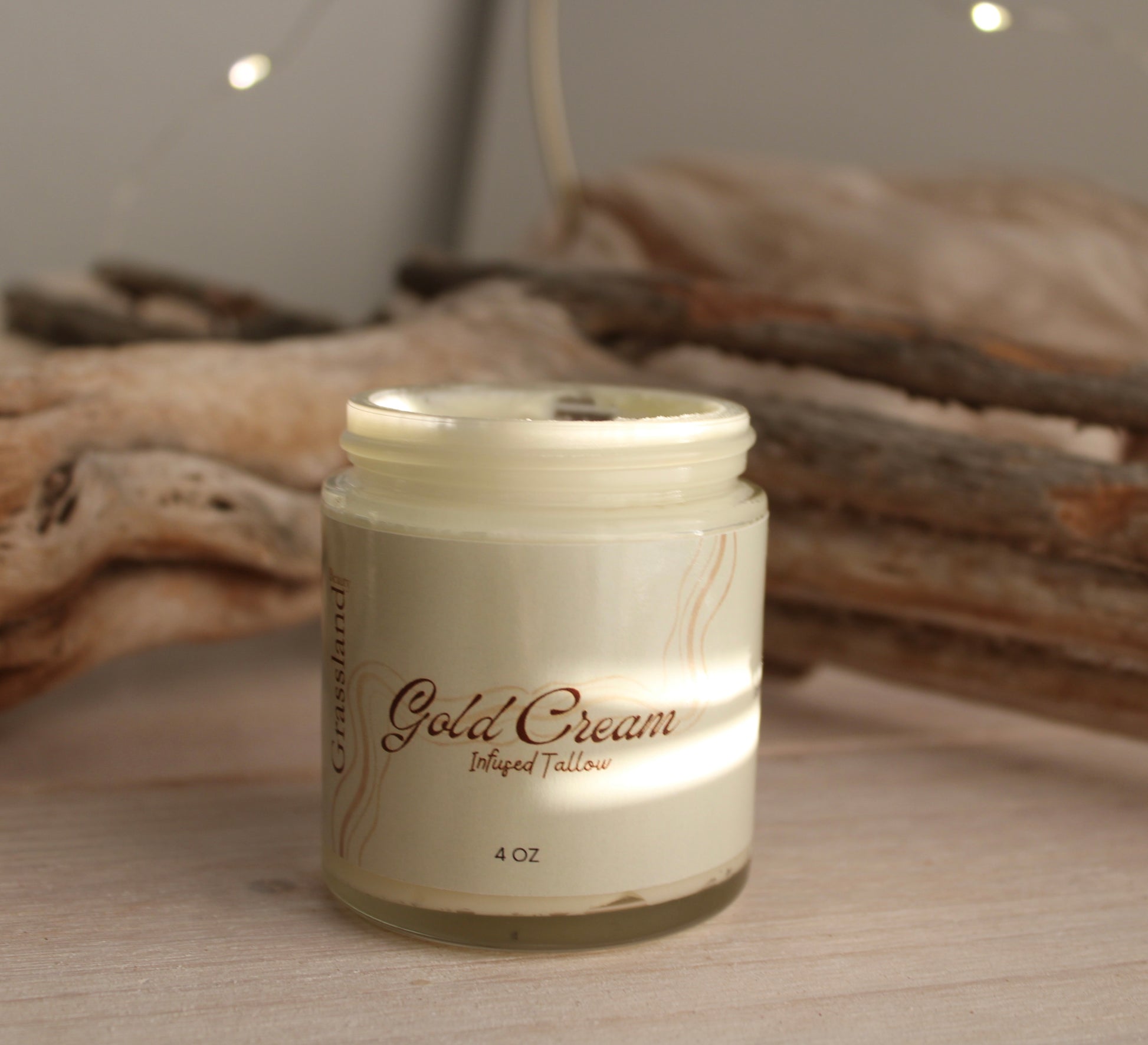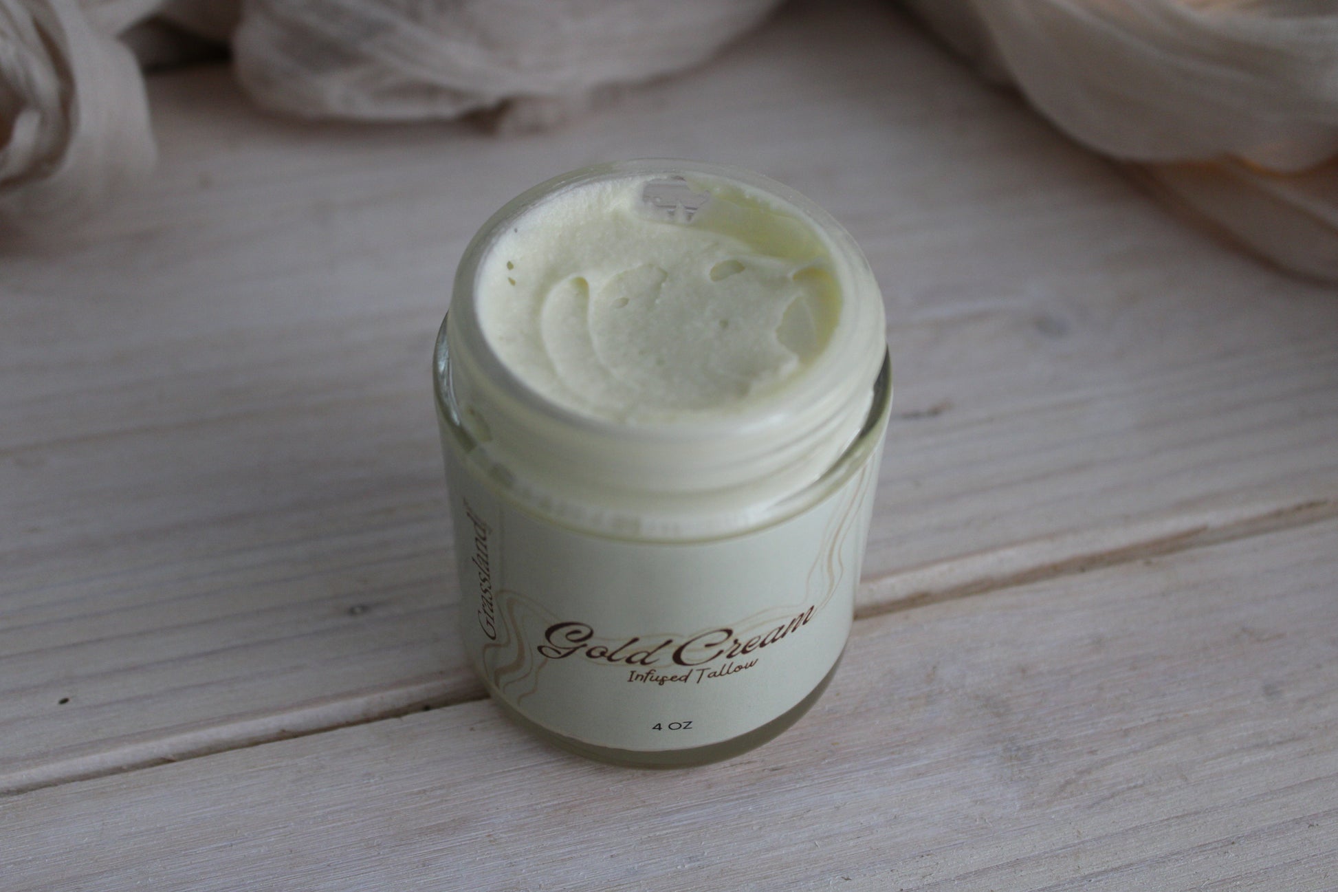 Our Gold Cream is a meticulously crafted tallow balm infused with Chamomile flowers, Calendula Flowers, Jasmine flowers, and Yarrow flowers. Designed with a special focus on sensitive skin. The scent is a fragrant herbally charged and warm scent profile.