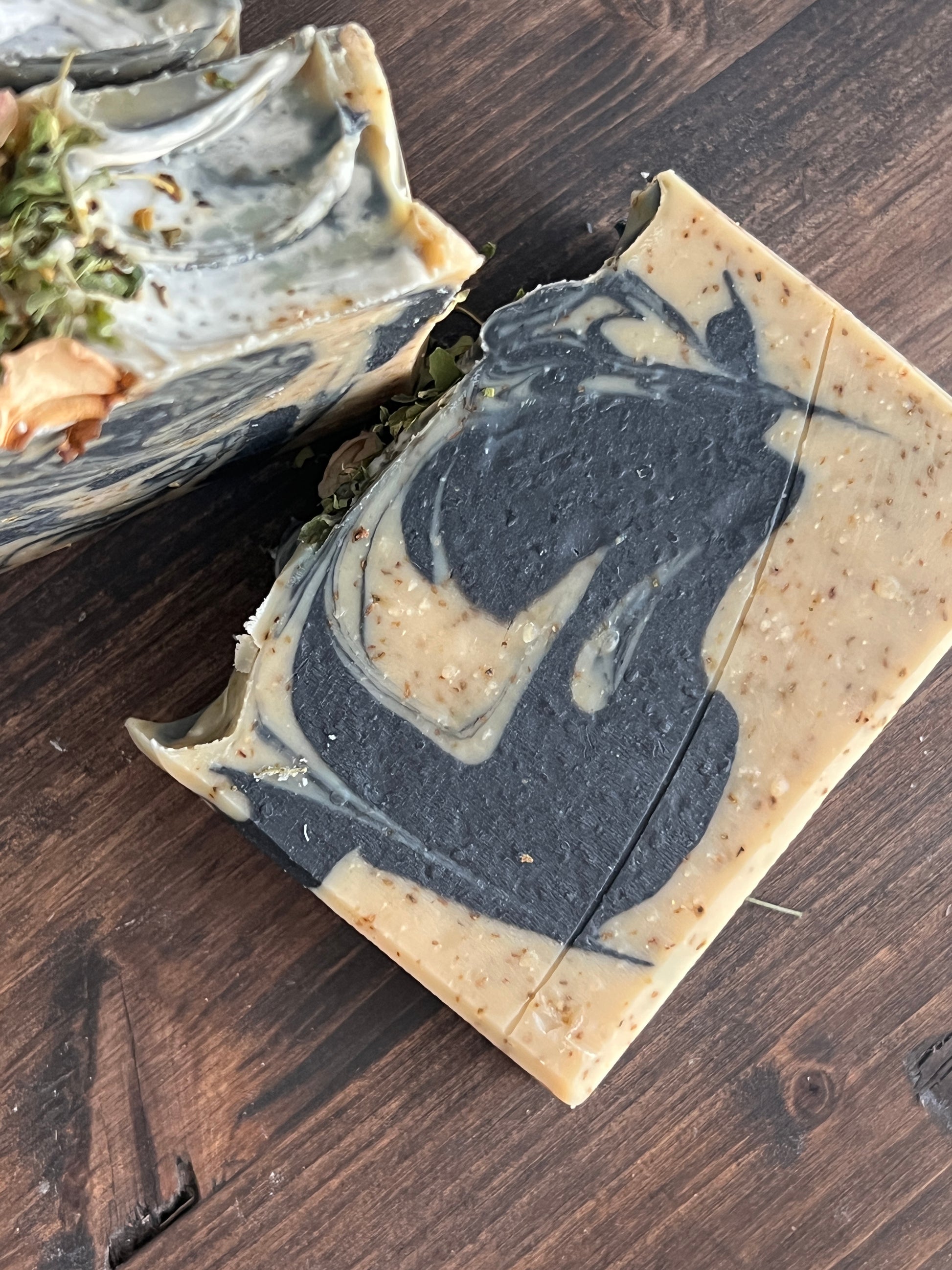 Ultra conditioning, lots of thick bubbles, and will leave your skin silky smooth is how we would describe this bar. Made with natural colorants and essential oils only. This soap is scented with sweet orange, Rosewood and Grapefruit essential oils and colored with activated charcoal and powdered moringa. Truly refreshing in the shower.